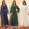Elevate your evening look with this elegant abaya dress, designed specifically for Muslim women seeking a blend of tradition and modernity. This striking piece features ruffled sleeves, adding a touch of sophistication and femininity to its silhouette. The dress is crafted from high-quality polyester, ensuring comfort while maintaining a flattering drape. The embroidered tulle accents lend a dimension of intricate detail and luxurious texture, making it a perfect choice for special occasions and gatherings.