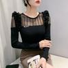 Women's Elegant Single Layer Mesh Small Standing Neck Flocked Printed Short Sleeve T-Shirt