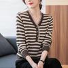 New Base Layer for Women's Spring and Autumn Design, V-neck Sweater, Striped Long-sleeved Knitted Sweater Top