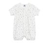 This is a romper with short sleeves and shorts. It has a tunic-like design that combines a light and thin knitted jersey that feels smooth to the touch with Liberty Tana Lawn with a cute small floral pattern. This baby wear has a loose silhouette that does not tighten the waist and is comfortable to wear.