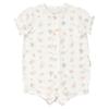 This romper has short sleeves and shorts. It has a tunic-like design that combines a light and thin knitted jersey fabric that feels smooth against the skin with Liberty Tana Lawn, which has a cute small floral pattern. This baby wear has a loose silhouette that does not tighten the waist and is comfortable to wear.
