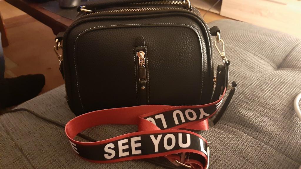 Veldig pen veske veldig lett, men avsporet og mangler skulderremmen Jeg setter en skulderreim til og lukkingen forblir åpen