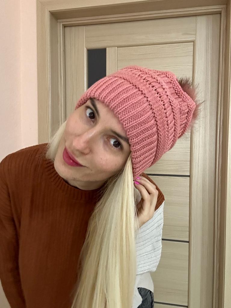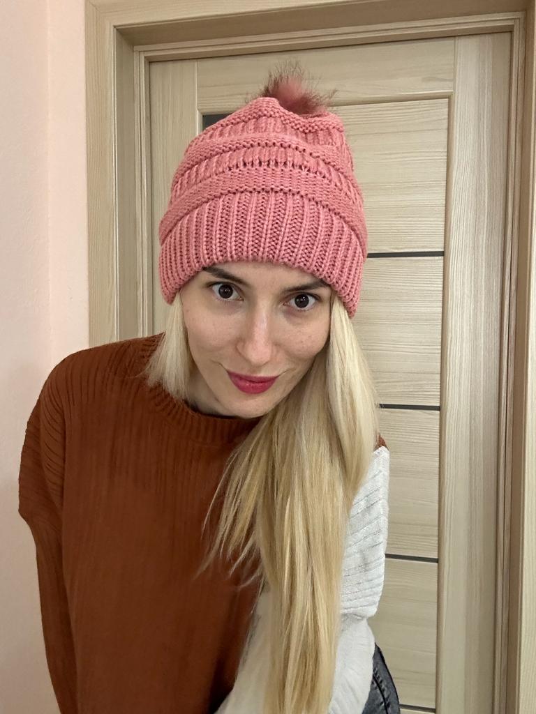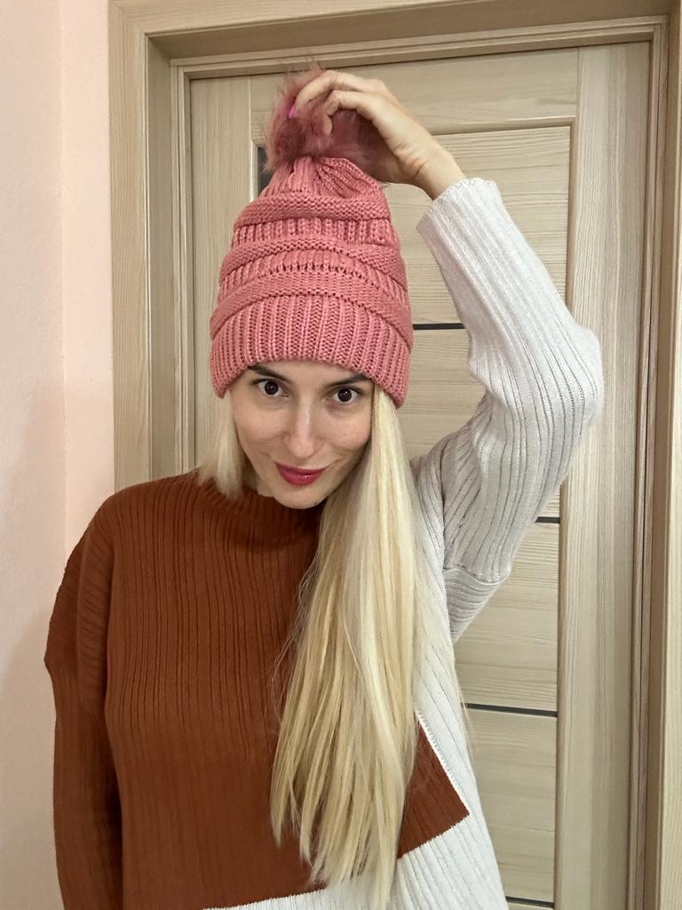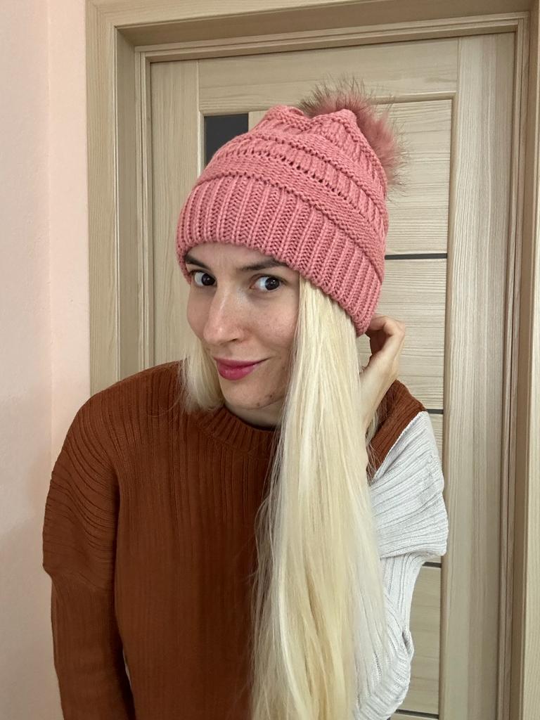 Luen er behagelig, strikkingen er av høy kvalitet. Etter vask mistet den ikke formen og falmer ikke. Pompongen har en knapp og kan løsnes.