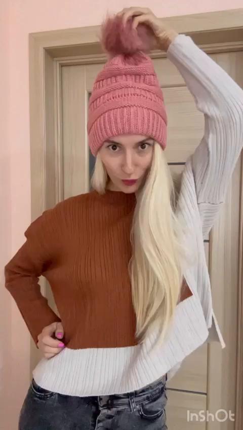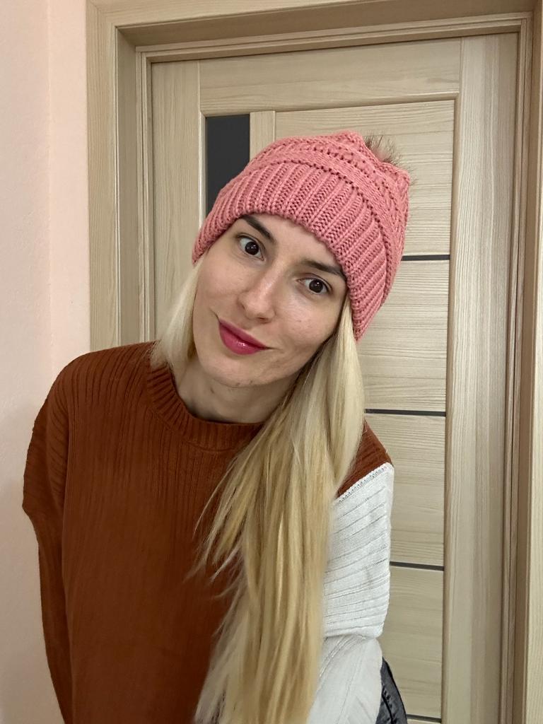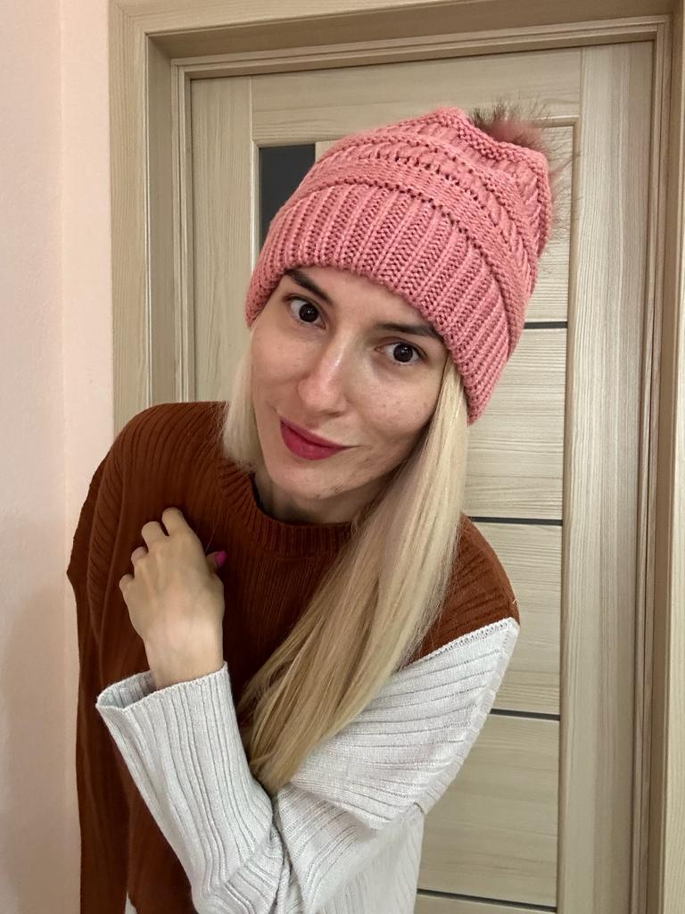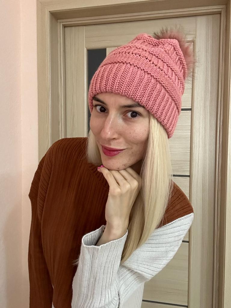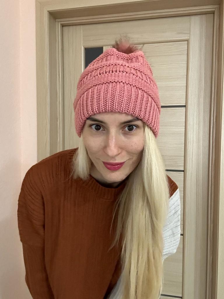 Luen er behagelig, strikkingen er av høy kvalitet. Etter vask mistet den ikke formen og falmer ikke. Pompongen har en knapp og kan løsnes.