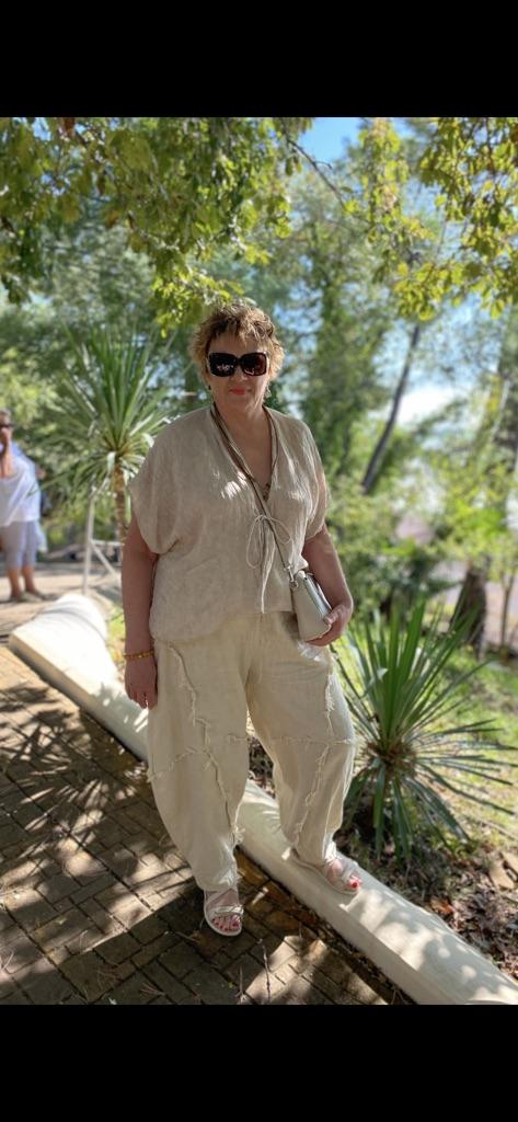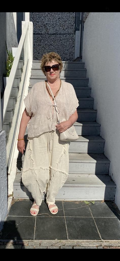 Utmerket linvest, tynn, behagelig. Til beige haremsbukser. Mine mål 104-96-110, akkurat passe. Under en skjorte eller singlet. Veldig stilig.