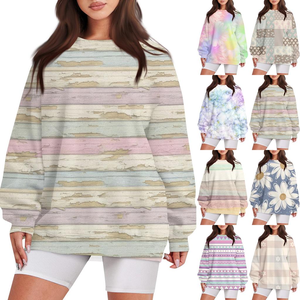 Women's Casual Print Round Neck Loose Long Sleeve Sweatshirt Top With Pocket