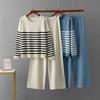 Høst Vinter Lazy Wind Løs V-hals Genser Dress Dame Stripe Langermet Strikket Brede Ben Bukser Todelt sett