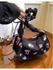 Flower canvas bag women's 2025 new drawstring shoulder bag floral bow armpit bag
