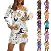 Women's Fashionable V-neck Long Sleeved Drawstring With Pocket Halloween Printed Casual Dress