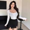 Stylish Beautiful Fashion Sexy Short Asymmetrical Curved Hem Shirt Women's Waist-Tight Slim Looking Ruched Button Top